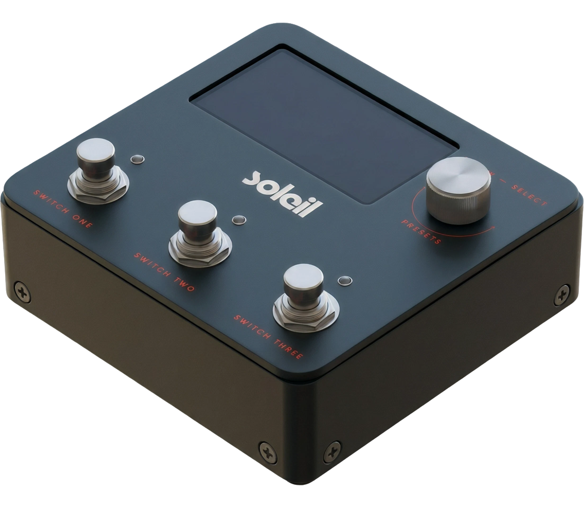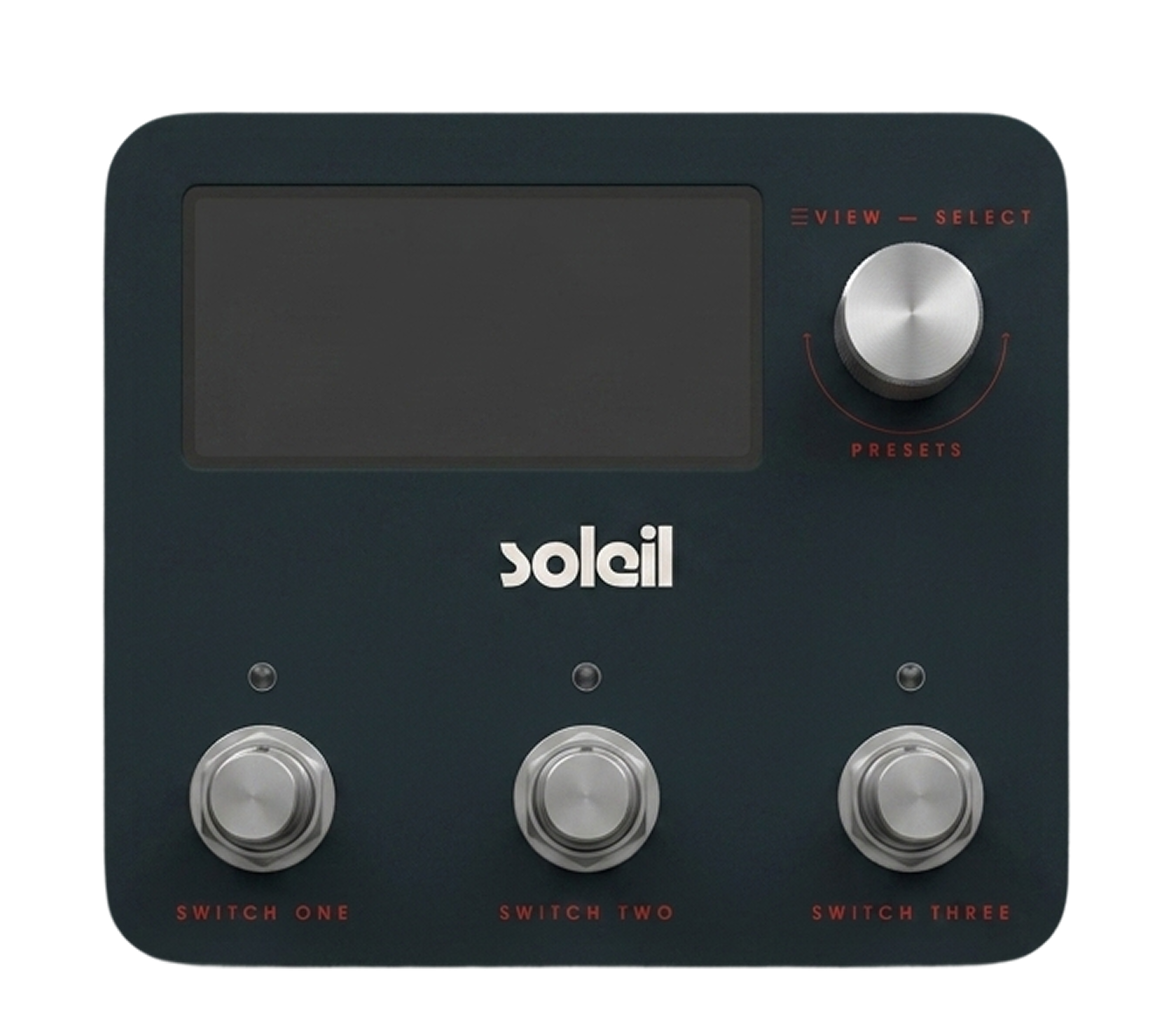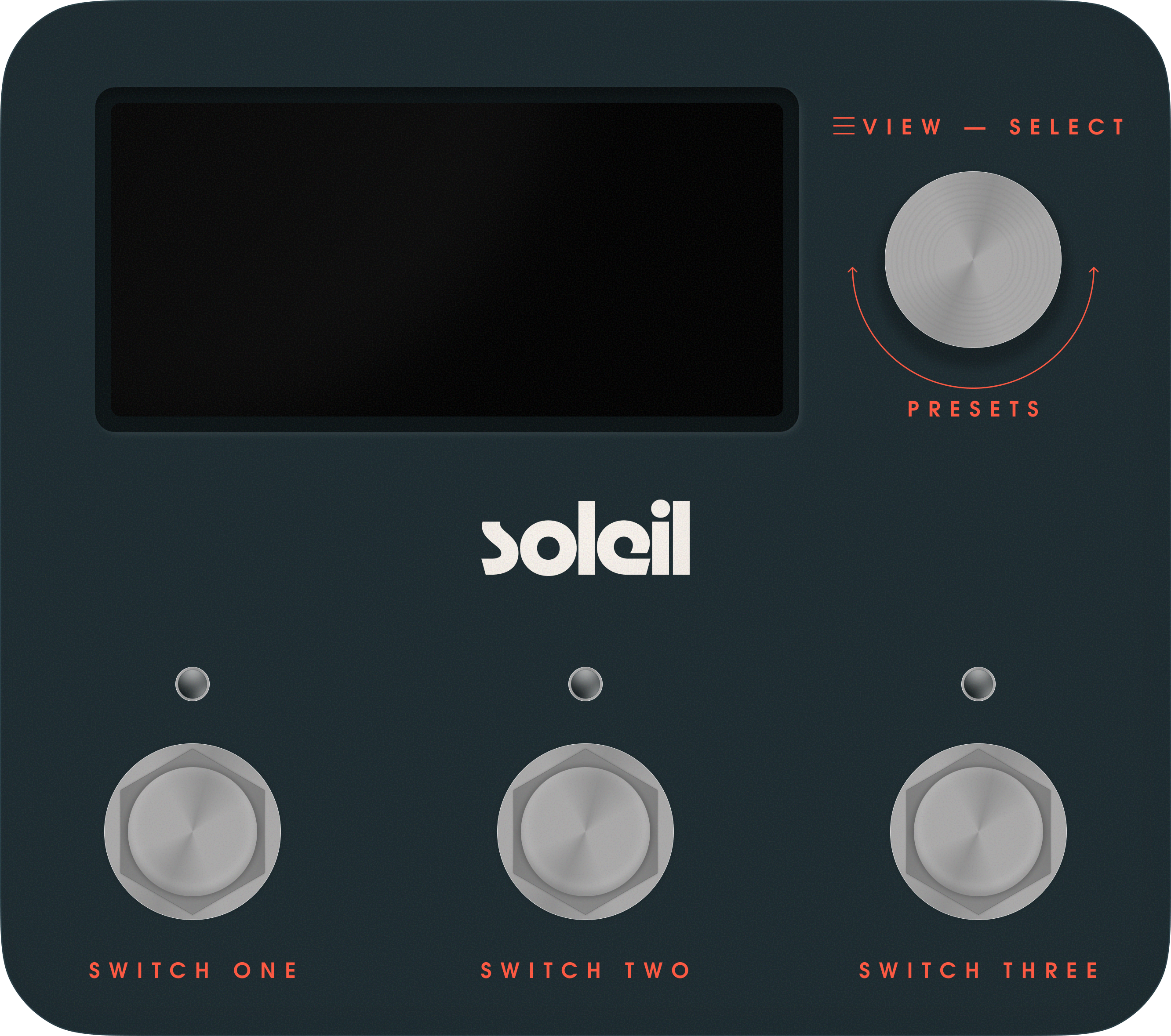 The Soleil enclosure uses a slate teal finish with silver hardware. The layout is intentional: a wide display and select knob on top, three footswitches across the bottom, each mapping directly to one of the three toggleable effects in the chain.